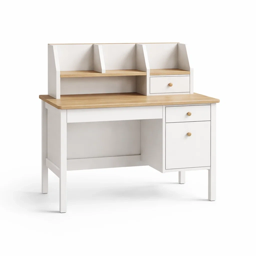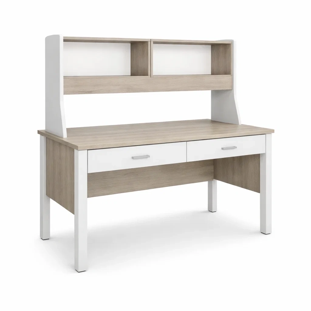 Bureau en bois blanc et chêne avec étagères et tiroirs