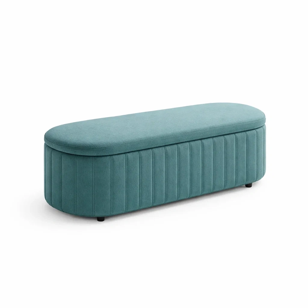 Le banc de rangement est en tissu polyester bleu sarcelle avec une structure interne en bois. Les pieds sont en plastique.