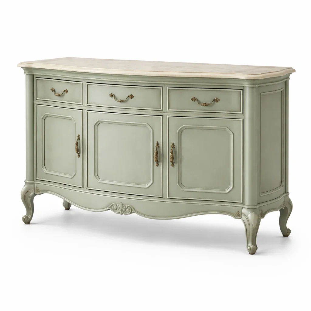Ce buffet est fabriqué en bois avec une façade courbée. Il comprend trois tiroirs et trois portes. Les poignées sont en métal. Dimensions : largeur 150 cm, profondeur 50 cm, hauteur 90 cm. Limite de charge totale : 50 kg.