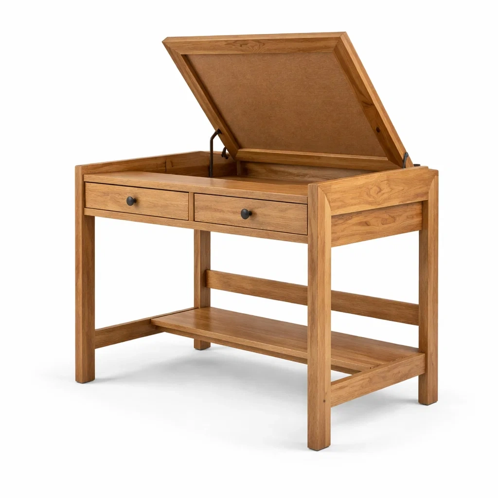 Le bureau est fabriqué en bois de chêne massif, offrant une structure robuste. Il dispose de deux tiroirs spacieux pour un rangement pratique et un miroir dissimulé sous le plateau.