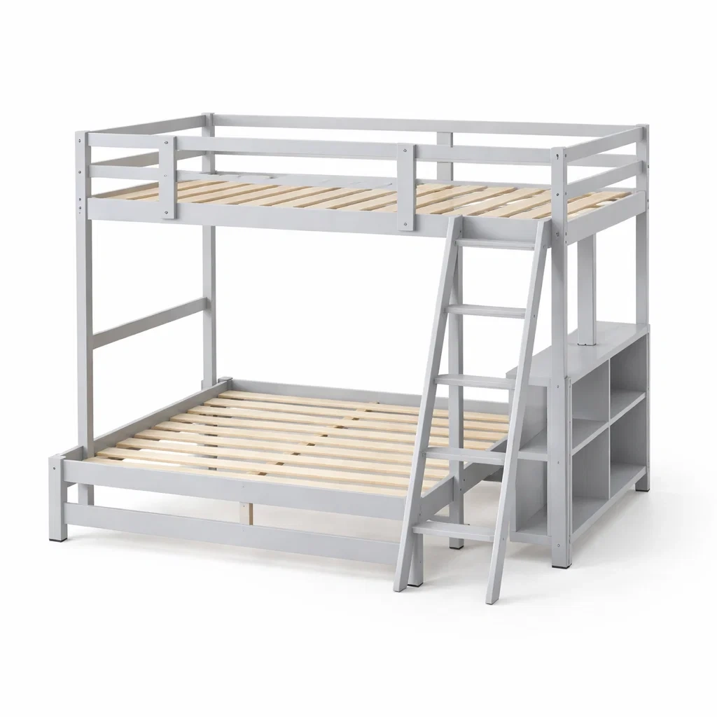 Fabriqué en pin massif, ce lit superposé comprend des barreaux en pin pour la sécurité et la stabilité. Il dispose d'une échelle intégrée et de plusieurs étagères de rangement pratiques. Dimensions : 200 cm de longueur, 135 cm de largeur et 160 cm de hauteur. La couleur grise confère un aspect moderne. Le poids maximal supporté est de 150 kg. Convient aux enfants à partir de 6 ans, respectant les normes de sécurité EN 747-1.
